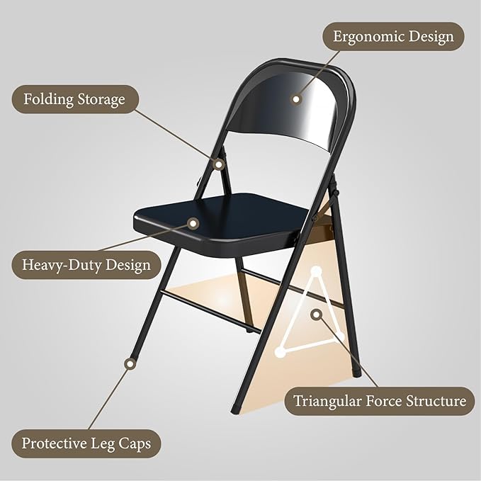 - 【Sturdy and Durable】Our folding chair features a thickened steel frame structured in a triangular shape, ensuring sturdy support. Non-slip pads on the chair legs prevent scratches on your floor and keep the chairs securely in place